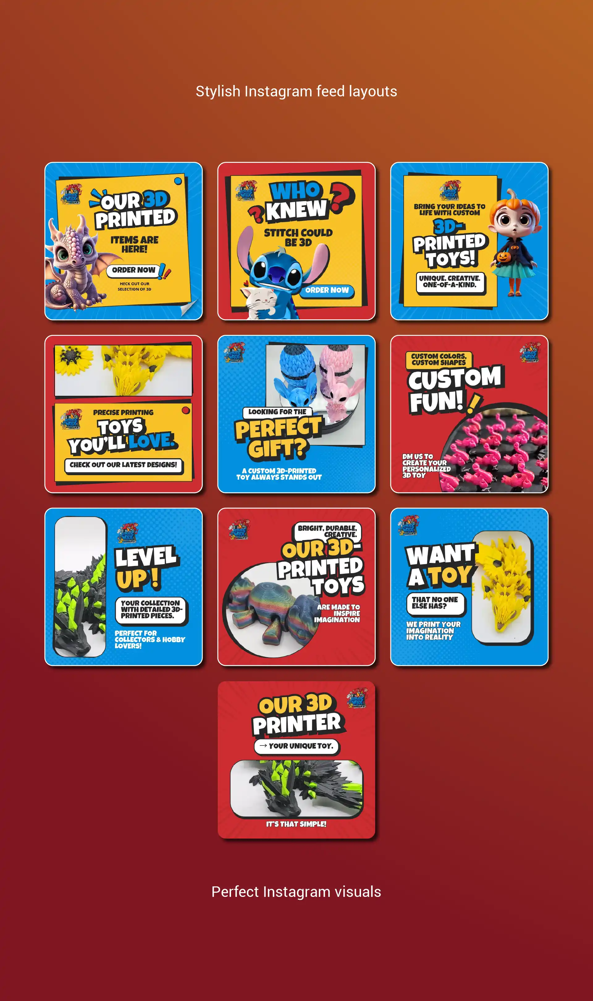 This project focused on designing a cohesive Instagram feed for a 3D printed toy brand, aiming to create a visually engaging and scroll-stopping social media presence. The goal was to transform product posts into a strong visual storytelling system that highlights creativity, innovation, and playfulness.